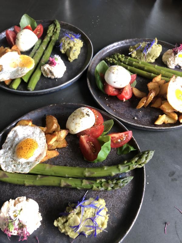 Ich reiche noch ein Resteessen mit Spargel, dicke-Bohne-Guacamole, Spargel, Tomaten mozzarella , Chtipiti, Bratkartoffel und Wachtelspiegelei nach. :)