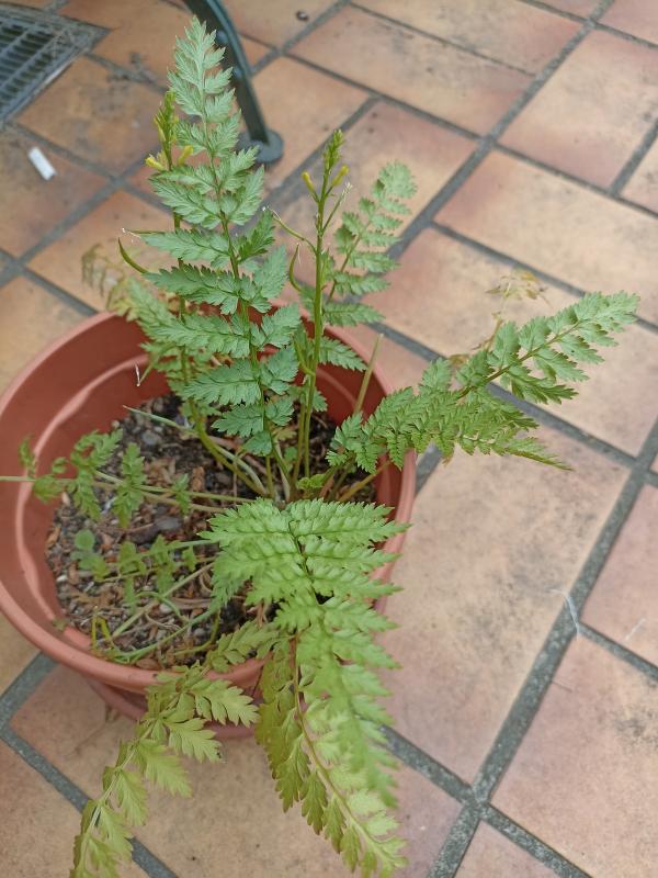 Was ist denn hier in einem grad leerstehenden Topf von selbst gewachsen? Erst dachte ich an Farn, dann an Süßdolde, aber die blüht doch weiß, oder? Der Stängel, der sich nun zeigt und bald aufblühen wird, scheint aber eine eher gelbliche Blüte zu zeigen. ???