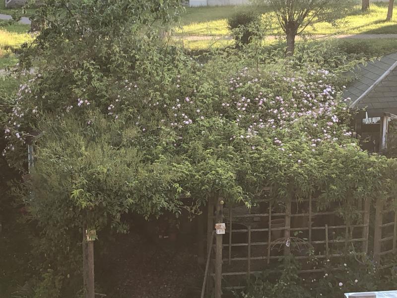 Paul‘s Himalayan Musk hat das Spektakel eröffnet. Ich habe beschlossen, dass er auch das Sommerhaus erobern darf. Im Baum ist er auch schon angekommen. Ich werde wohl die Leitstangen abnehmen, solange ich noch drankomme.