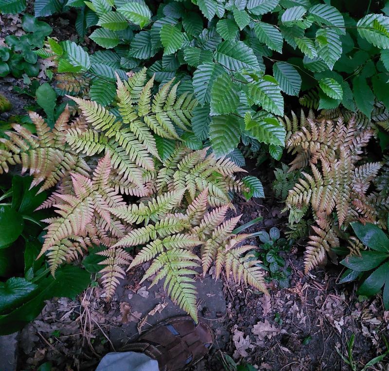 Vom Dryopteris erythosora hatte ich mir vor Jahren ein paar schöne sattgrüne Exemplare im Spätsommer gekauft, um zu schauen, wie Farne hier in meinem neuen Garten überhaupt gedeihen. Im nächsten Frühjahr war ich dann ganz empört, dass sie so bunt austreiben.