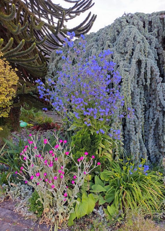 Falsche Lychnis! Auf der Tüte stand weiss. Nun ja. Anchusa, Hemerocallis (fast), und eine nichtblührnde Phlomis. Die kommt da weg. 5 Jahre ohne Blüten sind genug