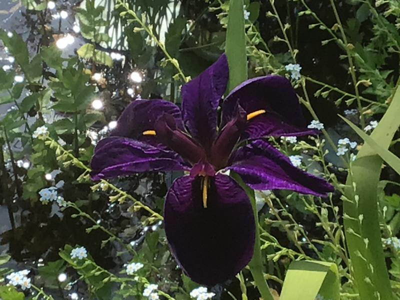Im Teich blüht jetzt eine Sorte der Louisiana Iris „ Black Gamecock“ Ea ist natürlich nicht Schwarz sondern ein dunkles Lila