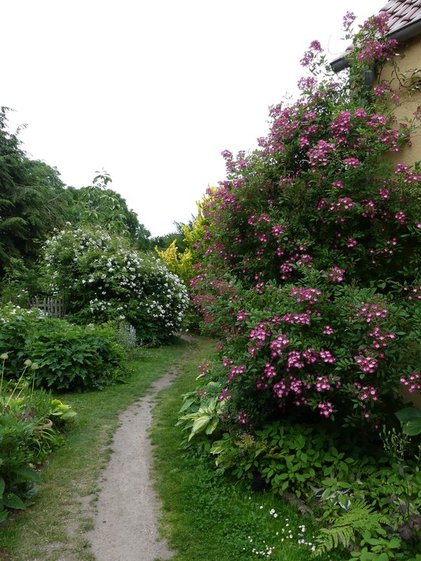 Und Guirlande Rose, die hier an 2 Rosenbögen gezogen wir,d sie sitzt in der Mitte. Sie beginnt erst , verbandelt sich aber im unteren Bereich sehr schön mit Bellard, diesen Kontrast mag ich sehr gerne.
