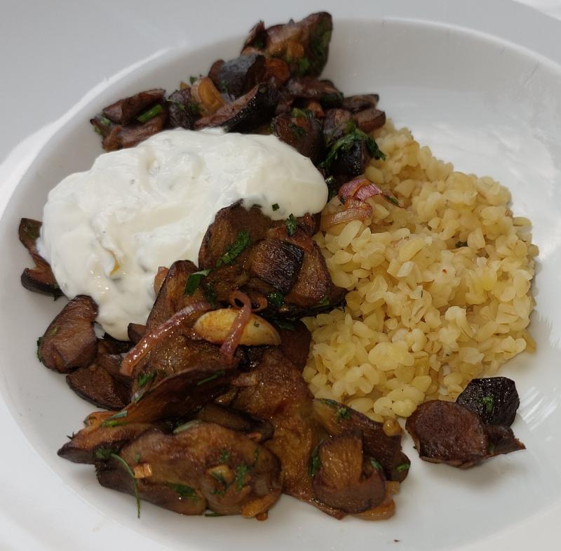 Maronenröhrlinge mit Zwiebeln, Knofi und frischem Koriander, Kräuterquark