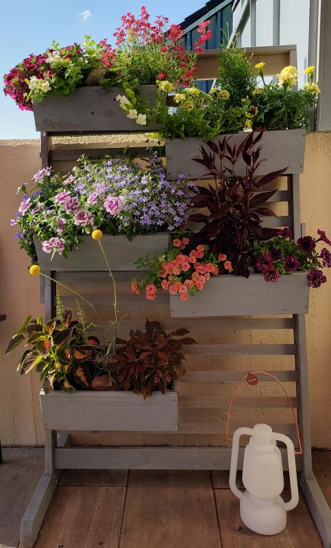 Hier explodiert bei den Temperaturen gerade mein Vertikalbeet, trotz Schatten durch die Markise. Der Buntnessel blüht schon! Die Craspedia wird zu hoch.