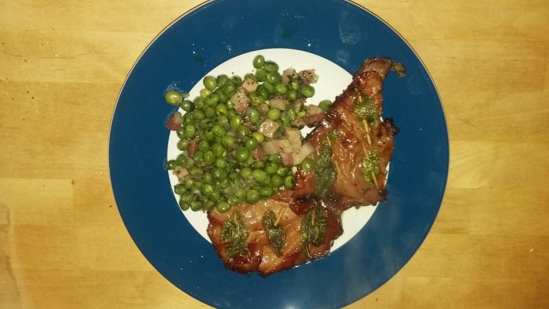 Hier gab es Saltimbocca und Piselli alla Monteaperti (Zwiebel, Knoblauch, Pancetta und Petersilie), dazu (gekauftes) Tomatenciabatta. Allerköstlichst :D