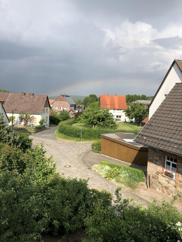 Überm Weserbergland wirds gerade richtig dunkel. Mal sehen, ob wir hier was abbekommen. Die Regenwand und ein doppelter Regenbogen sind schön zu sehen. Ganz links außen ist sogar ein dritter Regenbogen, wenn auch nur seeeehr schwach. Es grummelt auch und es kamen hier 3 Tropfen runter ...