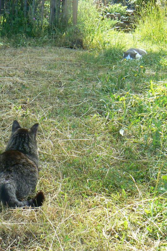 Man taxiert sich, außer einem kleinen Fauchen passiert normalerweise nichts. Heute Abend bin ich mit beiden auf dem Pflaster vor dem Haus gesessen, alles friedlich. Aber noch ist er nicht im Haus :-\