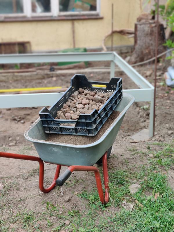 Gut 5 qm Fläche habe ich gestern 20 cm tief ausgehoben, weil es als ehemaliger Boden eines Schuppens so tief mit Lesesteinen ausgefüllt war. Alles per Hand durchgesiebt...