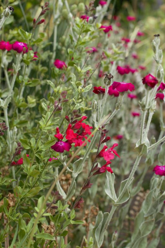 Viele Salbeien sind im/nach der Winter verschwunden. Die überlebenden beginnen jetzt mit der Blüte. Mit wuchernde Lychnis. :) (korrigiert: Silene )
