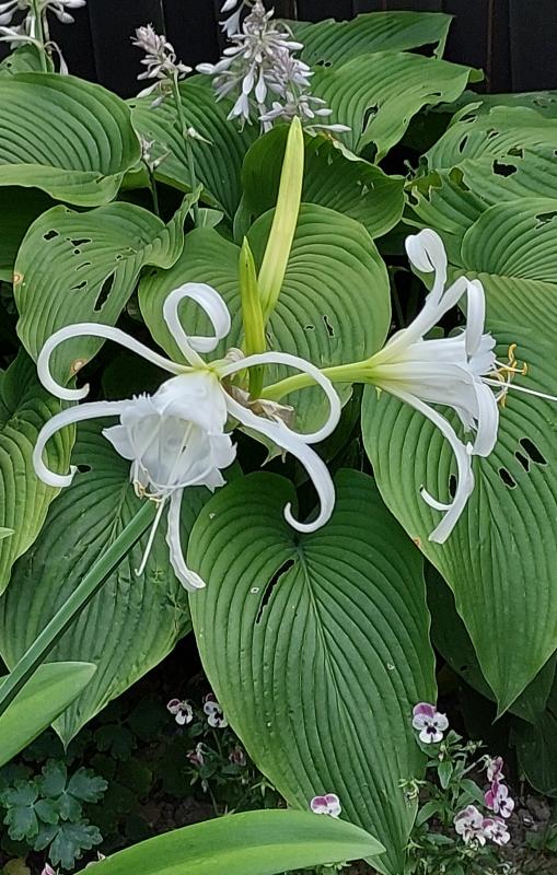Ismene vor dem grossen Hosta. Sahor blühen immer noch die Hornveilchen.