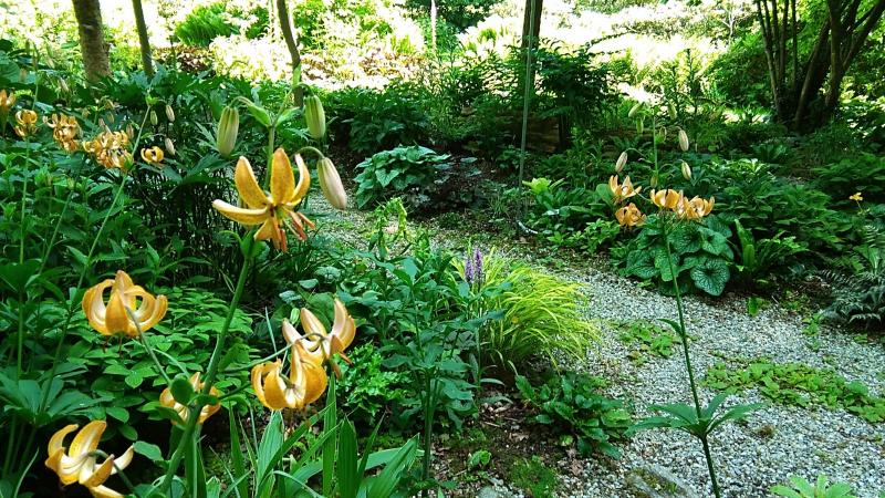 Das sieht hinreißend schön aus, so frisch und üppig, die vielen verschiedenen Farne und andere Blattschmuckstauden! :D Nur die Bank steht falsch, die müsste dort stehen, von wo Du das Foto gemacht hast, um das Beet auch gebührend bewundern zu können. ;)