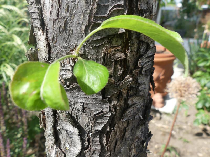 Der Baum ist willig wieder ausgetrieben, so sieht er jetzt aus. Hoffentlich war das nicht der Startschuss für Ausläuferbildung, schneiden will ich ihn in Zukunft regelmäßig.