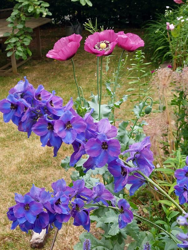 Mohn und Rittersporn ( d. elatum `Finsteraarhorn ´) vor " strohigen " Rasen - klasse, sympathische Wortschöpfung von Euch für verdorrte Flächen.