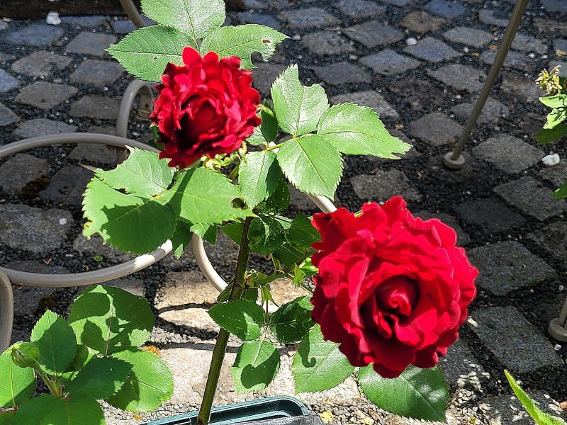 2021, nach dem großen Lockdown, ging unser erster Wochenend-Trip im Juni nach Heidelberg und dort sah ich eine wunderschöne dunkelrote Strauchrose. Ich konnte nicht anders, als einen Steckling zu mopsen :-[. Er ist angegangen und blüht nun :).