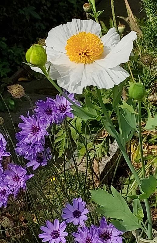 Sturm, einiges musste ich neu aufbinden bzw. stäben. Romneya coulteri mit Rasselblume.