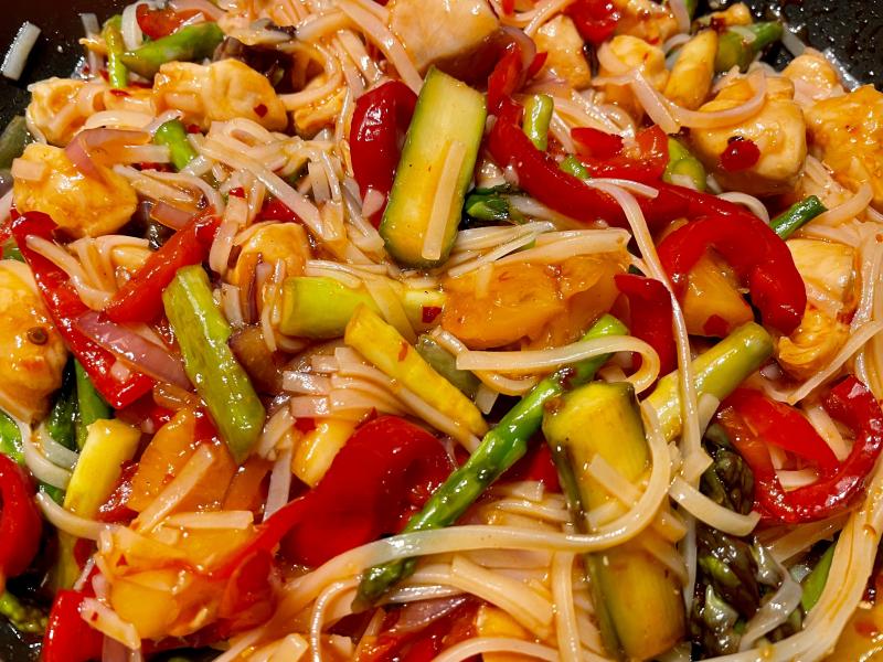 hier letzter gartenspargel in einem süß-scharfen asia-crossover mit reisnudeln, spitzpaprika, huhn und ananas