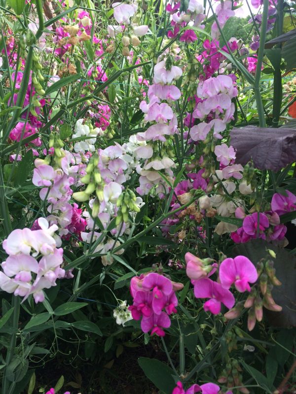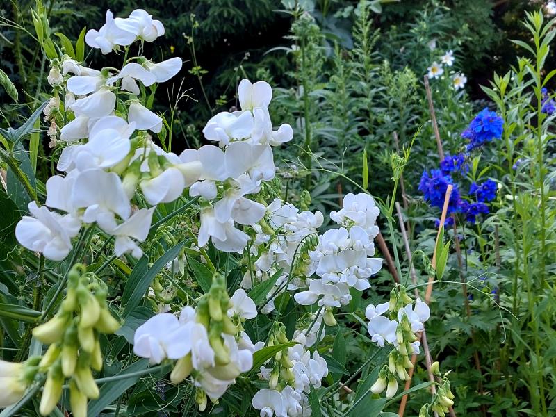 Weiße Staudenwicke, im Hintergrund Rittersporn ( der mit der ersten Blüte so gut wie durch ist )