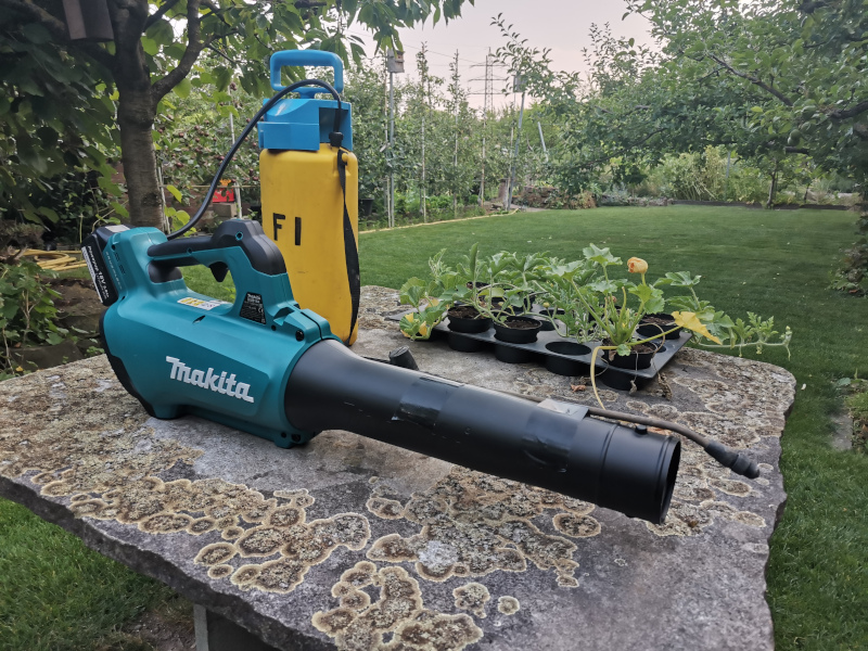 Habe gestern am Prototyp gebastelt. 08/15 Gloria 5L 3 bar mit Hohlkegeldüse, dazu ein Akkulaubbläser.