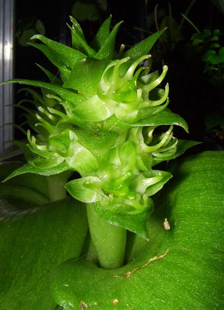 Whiteheadia bifolia ist eine nahe Verwandte der Massonia (manche Autoren rechnen sie gar dieser Gattung zu) und blüht mit grünlich-weissen Blüten. Diese sind sehr eigenartig: dem Auge bieten sie zunächst nur wenig außer diesem Eucomis-artigen Blütenschopf nach Ananas-Fasson, ...