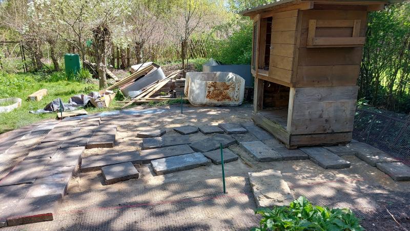 Ich habe jetzt in der Bucht, geschenkt, 100 Gehwegplatten bekommen und zu mir geschafft. Die kommen doch wieder auf den Boden, dann kann etwas Wasser versickern. Darüber kommt ein Hühnerauslauf 3x4 m. Der wird so hoch aufgestellt, dass das alte Kaninchenhaus da in die Traufe passt.