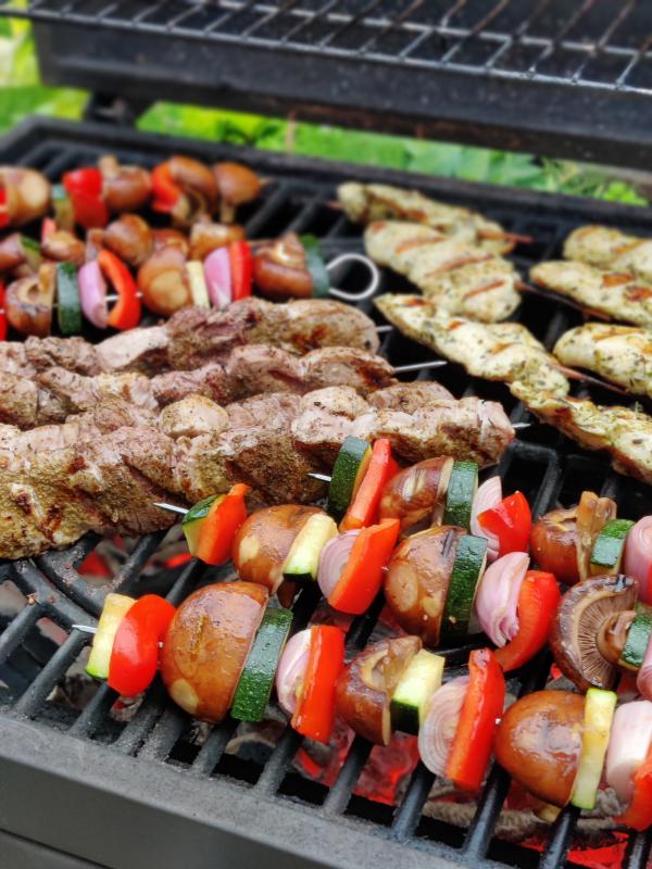 Hier gab es heute vom Grill. Filet vom Rind, Schwein und Hähnchen mit Gemüse und Kartoffelsalat.