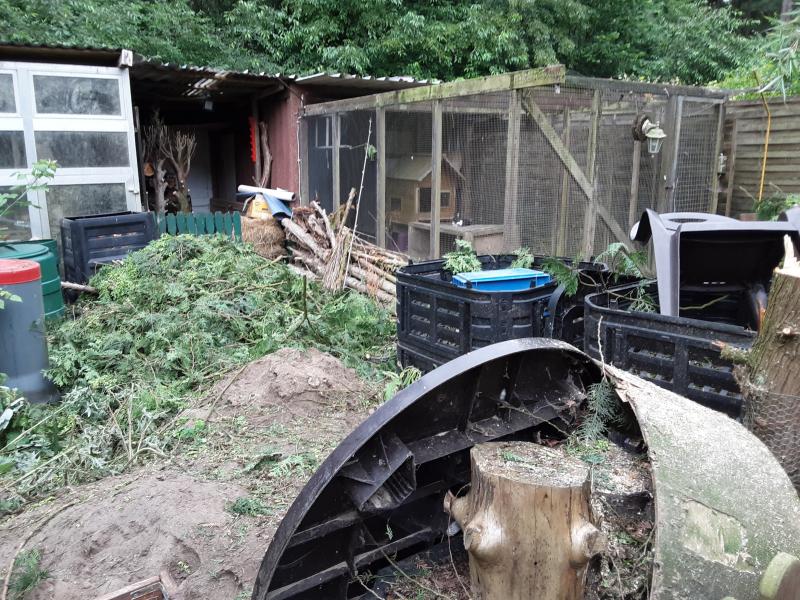 Die Tonnen und Komposter kommen auch noch weg, der Platz wo sie hin sollen muss allerdings erst frei geräumt werden, dort lagert noch Holz welches erst geschnitten und in den Schuppen geräumt werden muss. Dieser ist aber noch voll von ungeschnittenem Holz, bevor das geschnitten wird will mein Freund aber noch das Dach reparieren da es dort seit Jahren durchregnet.