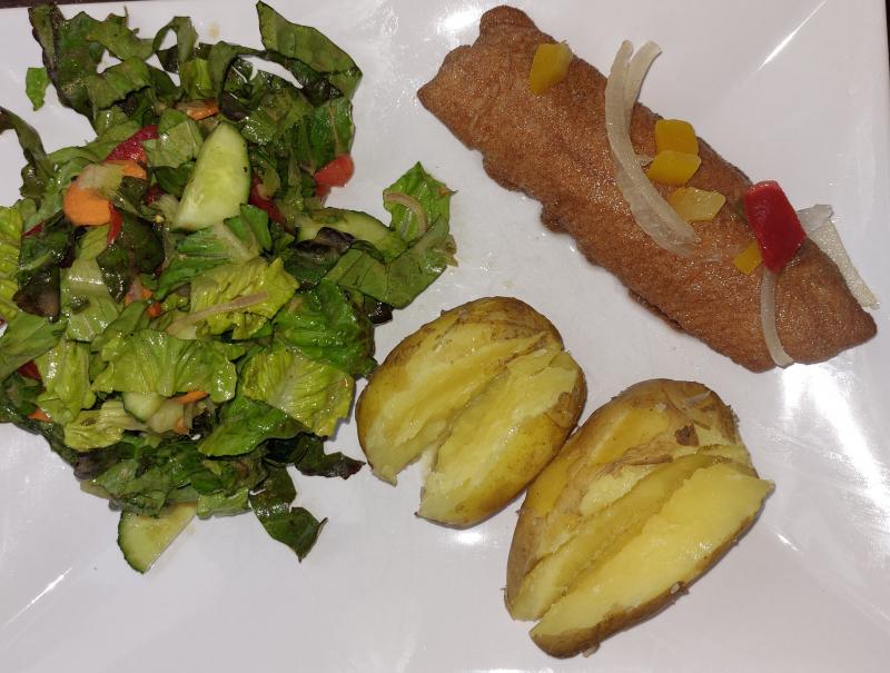 Sülze mit Bratkartoffeln und großem Gartensalat. Ist noch viel übrig, gibt es heute nochmal mit Gurkensalat.