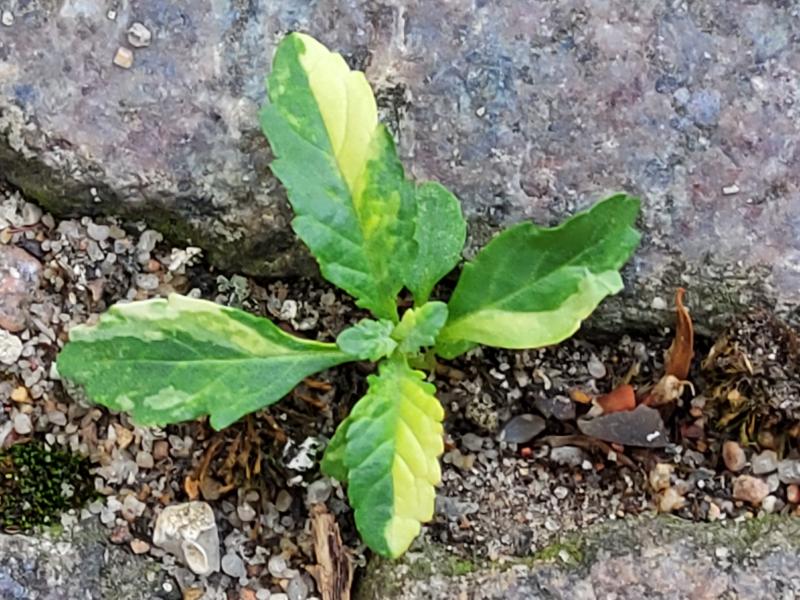Ein Sämling in der Einfahrt, ich bin mir nur sicher, wenn es bei mir im Garten steht, ist es normalerweise nicht panaschiert. Was könnte das sein?