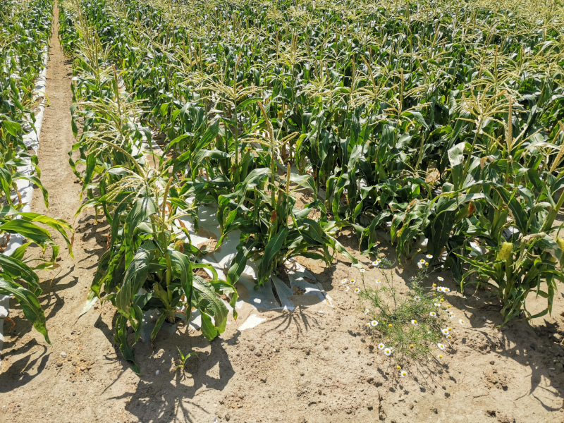 Überhaupt kann Mais sensibel sein. Momentan sieht man sehr schön, wie der Mais auf Schattenwurf und Konkurrenz um Wasser durch Straßenbäume reagiert.