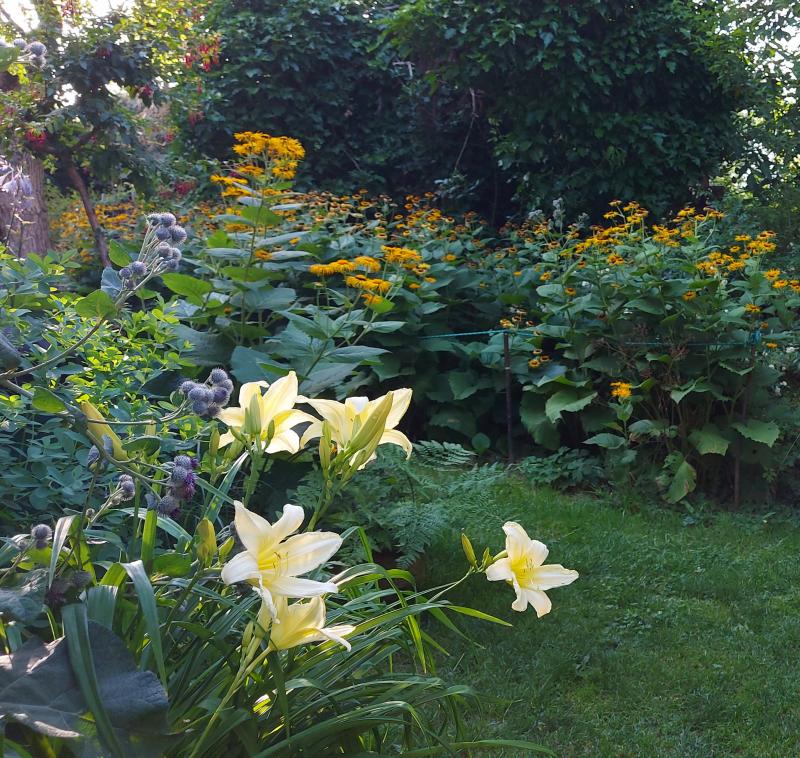 Hier ist's nur noch auf der Nordseite etwas üppiger. Hemerocallis, Arctium tomentosum, Inula magnifica