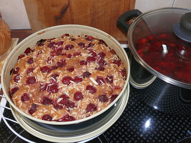 Schwarze Johannisbeeren und die letzten Sauerkirschen für einen Kuchen.