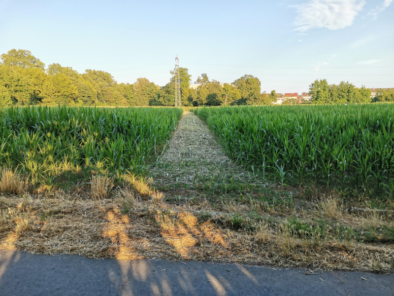Zu hinterm Dorf: vor ein paar Tagen kam der Mulcher, gestern der Wagen mit den Beregnungsrohren. Hab den Bauern gefragt ob er wirklich Mais beregnen will. Ja, es muss. Spanische Verhältnisse. Er hat ja nix gehabt seit dem auflaufen. Das der überhaupt noch so dastehen kann liegt auch nur am C4-Stoffwechsel.