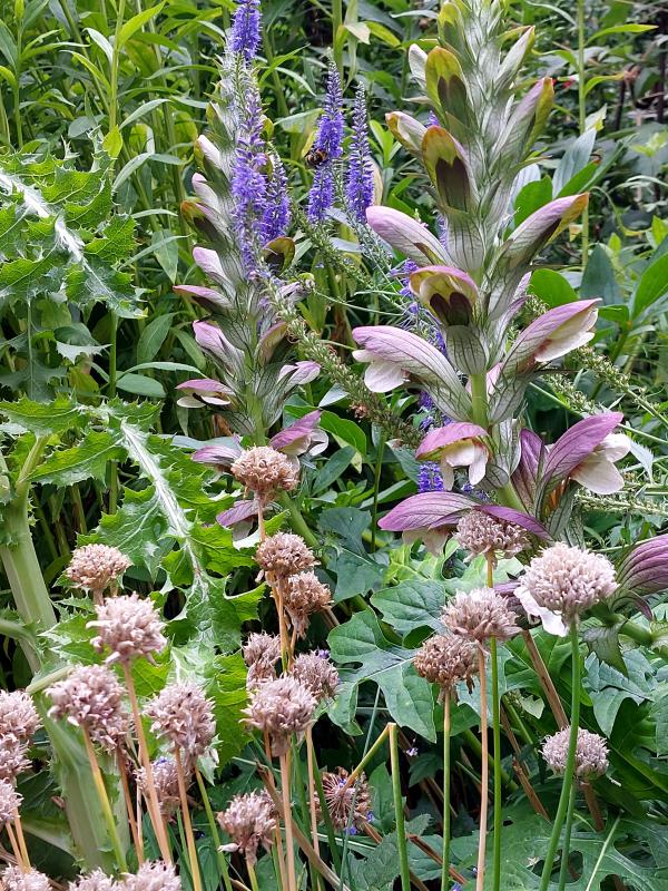 Pieksige Angelegenheit : Dorniger Akanthus, mit verblühtem Allium und verblühenden Ehrenpreis.