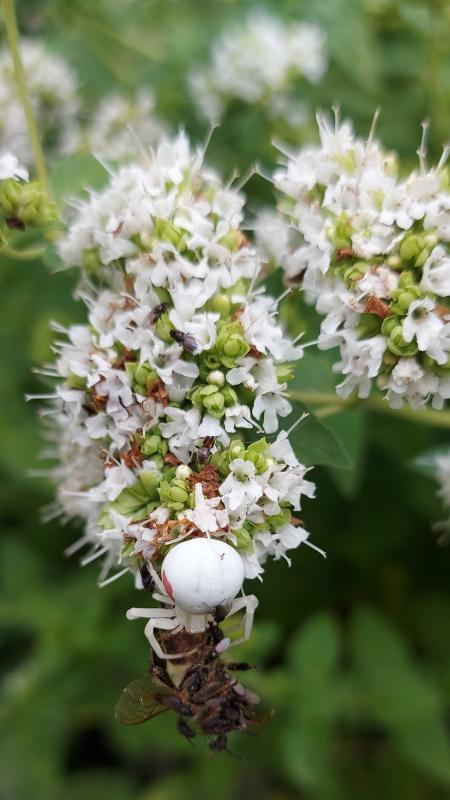 Ja, hier auch am weißen Origanum. Die Krabbenspinne hat sich den strategisch besten Platz ausgesucht und wird jeden Tag fetter. ;D