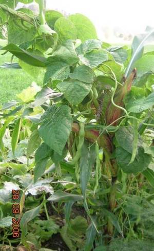 Bei der nur kleinen Fläche, die ich für den Gemüsegarten verfügbar habe, ist es nicht möglich, Stangenbohnen auf den Beeten anzubauen. Aber es ist ein gärtnerisch ungenutztes, südseitiges Plätzchen vor Bäumen und hohen Sträuchern vorhanden, gut geeignet für Stangenbohnen. Da ich aber einerseits kein ordentliches Beet mit Einfassung etc. anlegen wollte und anderseits dem mehrjährigen Anbau auf der selben Stelle nicht traue, bin ich zu folgender Lösung gekommen.4 Plastik-Pflanzkübel a 50 ltr. in der Reihe aufgestellt.Zwischen dem 1. und 2., sowie zwischen dem 3. und 4. Behälter je eine 2,5 m Dachlatte in den Boden geschlagen.Auf 2 m Höhe eine Querlatte in der Länge der ganzen Anlage abgeschraubt.Die Querlatte stützen mit 2 weiteren Latten, schräg nach hinten in den Boden geschlagen.Das entstandene Fußballtor ist die Hilfskonstruktion. Jetzt kommen die Kletterhilfen.In die Mitte eines jeden Kübels eine 3 m Stange gestellt, ohne Verankerung unten.Oben die Stangen an die Querlatte schrauben.Die anschließend eingefüllte Erde hält die Stangen unten fest.Eine sehr einfache, stabile und nach Ende der Saison leicht demontierbare Konstruktion. Die Erde wird jährlich ausgetauscht.Mit dem Ertrag aus dem Kübelanbau bin ich zufrieden, ein Vergleich mit einem Zelt auf einem regulären Beet fehlt mir allerdings.
