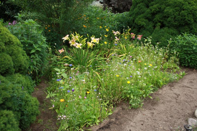 Gartenmargerite, Phlox, Ritterspornreste, weiße Wicke, Taglilien