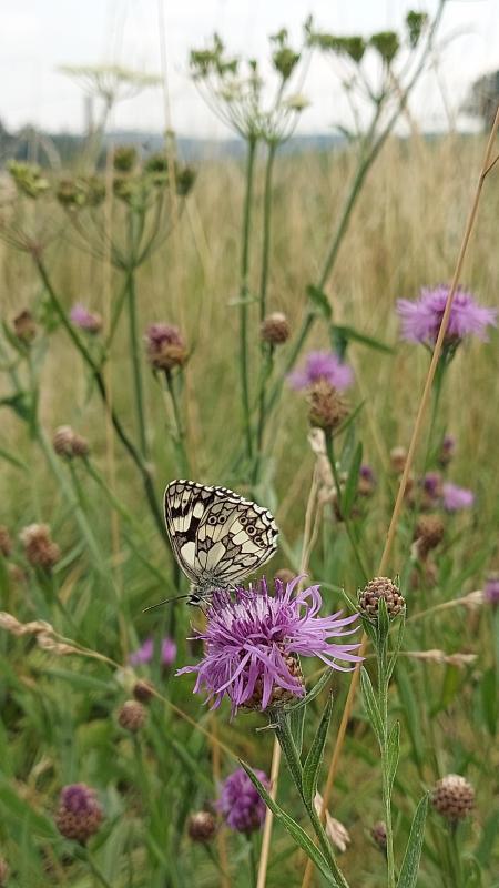 Seit ein paar Tagen sind aber immerhin frische Zitronenfalter da, und plötzlich auch die Wiesenfalter... Ochsenauge, Schornsteinfeger, braune Dickkopffalter und auf der Wiese inzwischen 4 Schachbrettfalter. Über die freue ich mich am meisten, weil es sie hier vorher nicht gab und sie sich erst seit der speziell angepassten Wiesenpflege (ein Streifen Altgras, ein Streifen im Herbst gemäht und Wiesenflockenblumen eingebracht) hier eingefunden haben.