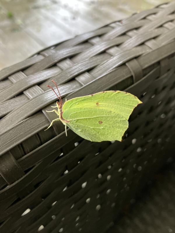 Er lag am Boden im Nassen. Wird sich wieder erholen, ist schon vom Tisch zum Stuhl geflattert. Er trocknet jetzt ab und wartet auf besseres Flugwetter.;)