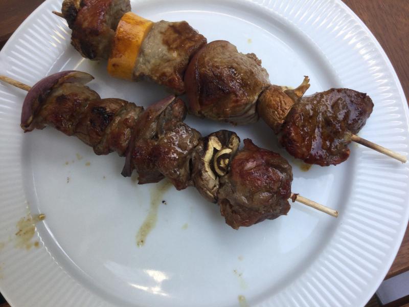 Hätte ich doch glatt nachgekocht, leider ist es für die Inbetriebnahme des Backrohrs zu heiß. Wir haben Spieße gegrillt, u.a. Ribeyesteak, mit Salat und Brot.