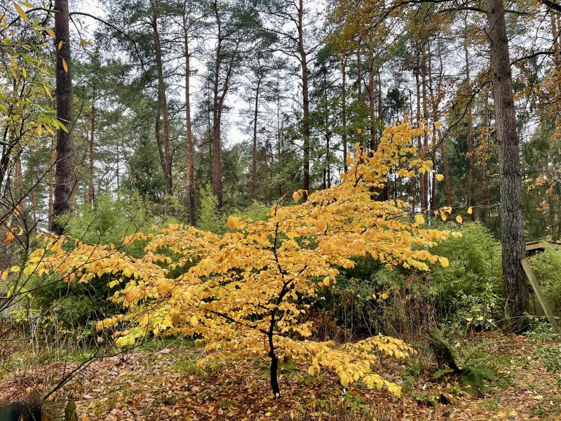 passt nicht zu meiner parrotie (die hatte ich ohne laub geliefert bekommen, meine ich), aber oft erlebt: die (stressbedingt) allerbuntest gefärbten containergehölze fallen im waldgartensauersand in blödgelb zurück