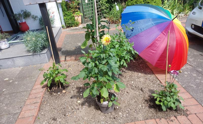 Dieses Wetter bereiten meinen Dahlien grosse Probleme. Trotz 2x giessen machen die im Vorgarten gepflanzten schlapp. Kann am Boden liegen, denn die am gleichen Standort im Kübel stehen, gedeihen besser. Auffallend ist der grosse Wachstumsunterschied. Was für Mohn eine optimale Erde (viel Split, Rest Kies und Lehm) ist, mögen Dahlien wohl nicht.
