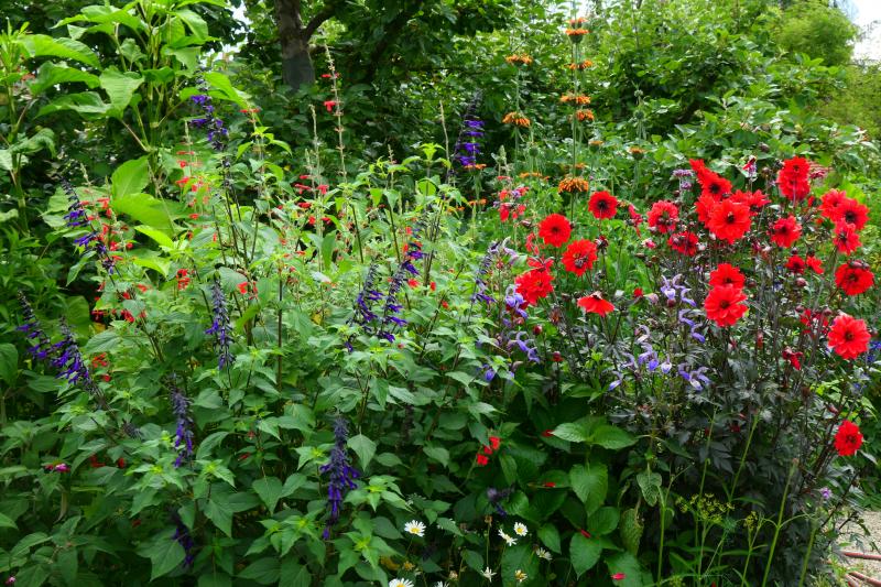 ...oder Dahlie Bishop of Llandaff mit Salvia Amistad, S. darcyi etc...