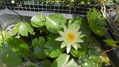 Sodale, lang ists her. Aber jetzt! Meine Seerose blüht! Im Mörteltrog auf meiner bratzelheißen Terrasse, ich freu mich so!