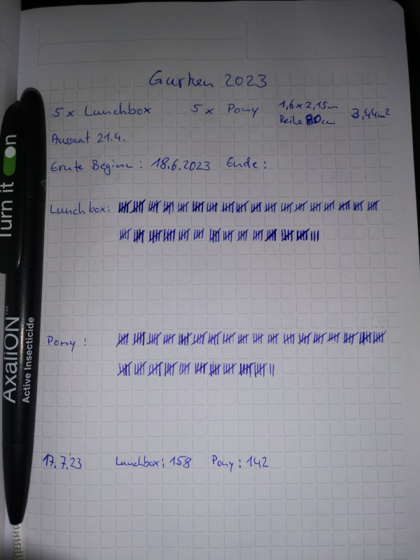 Nach einem Monat ernten gibts es nur geringe Unterschiede, von Lunchbox 158 Gurken geerntet und von Pony 142. Damit will ich aber nicht sagen die eine Sorte trägt gut 10% mehr, sondern das kann am Standort liegen und von Pony gibt es mittlerweile auch einen Pflanzenausfall wegen Kopfbrenner oder ähnlichem.
