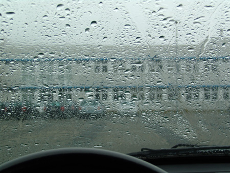 Hallo Fotofans,Kann man fotografieren, wie sich die Welt in Tropfen spiegelt? - Diese Frage hat Katrin neulich aufgeworfen, und es hat mir keine Ruhe gelassen.Nun, in Köln gab es heute genug Tropfen, um das auszuprobieren.1. Foto:Fassade eines Bürohauses unscharf durch nasse Autoscheibe. - Sorry für das prosaische Motiv, ich kam von einem - erfolgreichen  - Geschäftstermin.