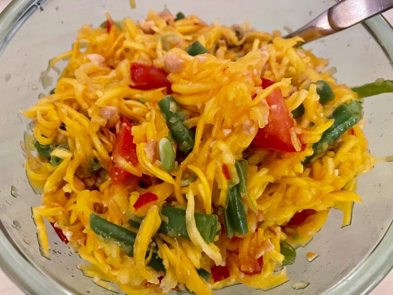heute stampfte ich som tam thai aus geschenktem gelbem gartenzucchino und mit den ersten gartenchilis…