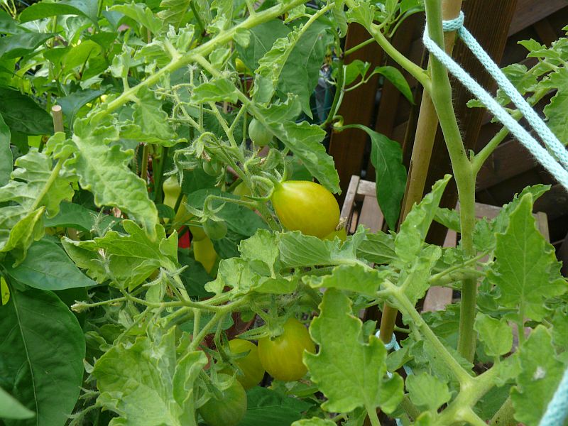 Die Herzchen-Tomate ist jetzt genau 1,2 m groß und die Früchte werden gelb.