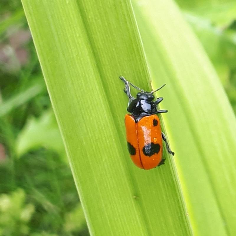 Das wollte ich auch gerade schreiben. Es ist der Vierpunkt Ameisenblattkäfer. Die Larve lebt auf verschiedenen Sträuchern und Bäumen Birke, Weißdorn, Eiche