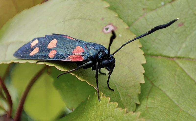 Gestern hatte ich die zweite Sichtung eines Rotwidderchens im Garten. Das erste Mal umflog es die Kronwicken und ich bin mir ziemlich sicher, dass es ein paar Eier abgelegt hatte. Gestern war ein Sonnenbad angesagt. Ich vermute Zygaena ephialtes, das Veränderliche Rotwidderchen.
